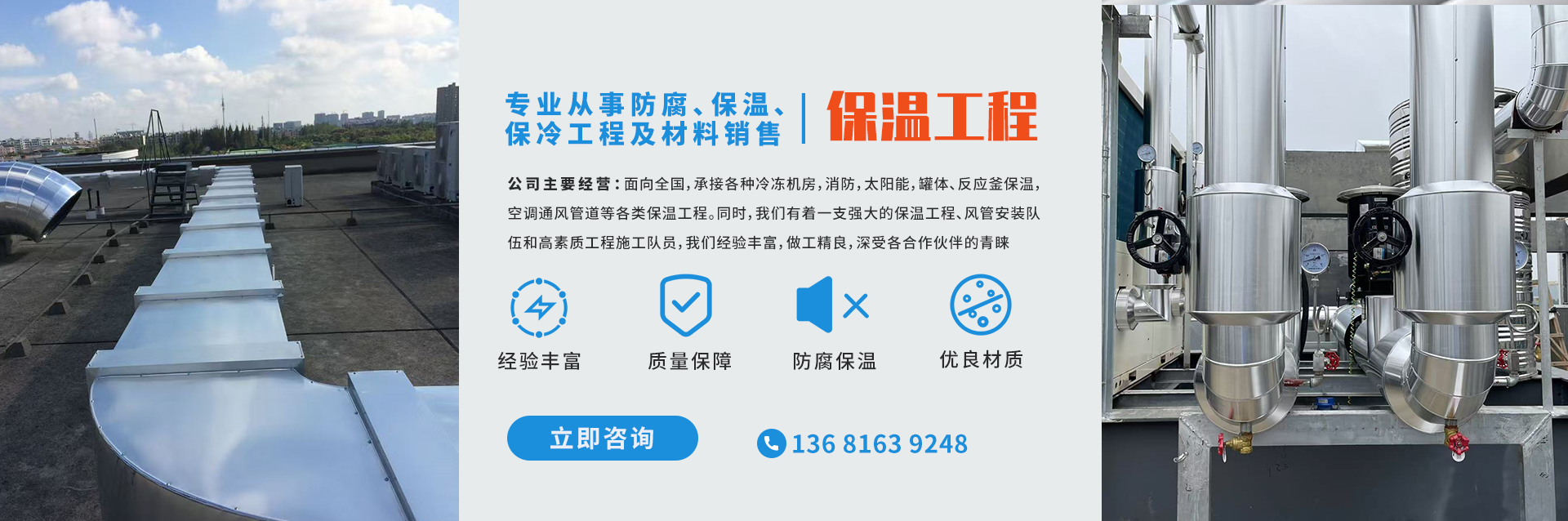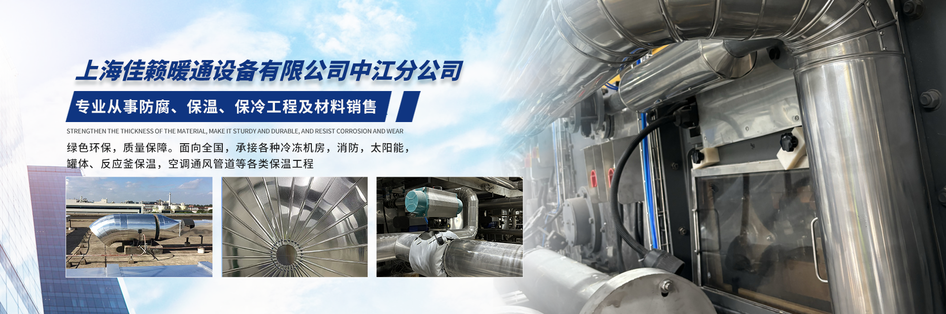 上海佳籁暖通设备有限公司中江分公司是一家专业从事防腐、保温、保冷工程及材料销售的公司,从2002年至拥有多年各类工程工作经验,绿色环保,质量保障。面向全国,承接各种冷冻机房,消防,太阳能,罐体、反应釜保温,空调通风管道等各类保温工程。同时,我们有着一支强大的保温工程、风管安装队伍和高素质工程施工队员,我们经验丰富,做工精良,深受各合作伙伴的青睐。我们凭着良好的信用、优良的服务与多家企业建立了长期的合作关系,并得到大家的一致肯定。我们真诚希望可以与各界朋友建立友好合作关系。